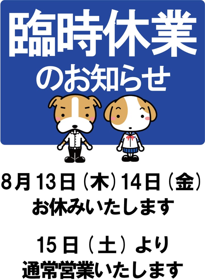 8月13日(木)14日(金)の2日間、臨時休業いたします。